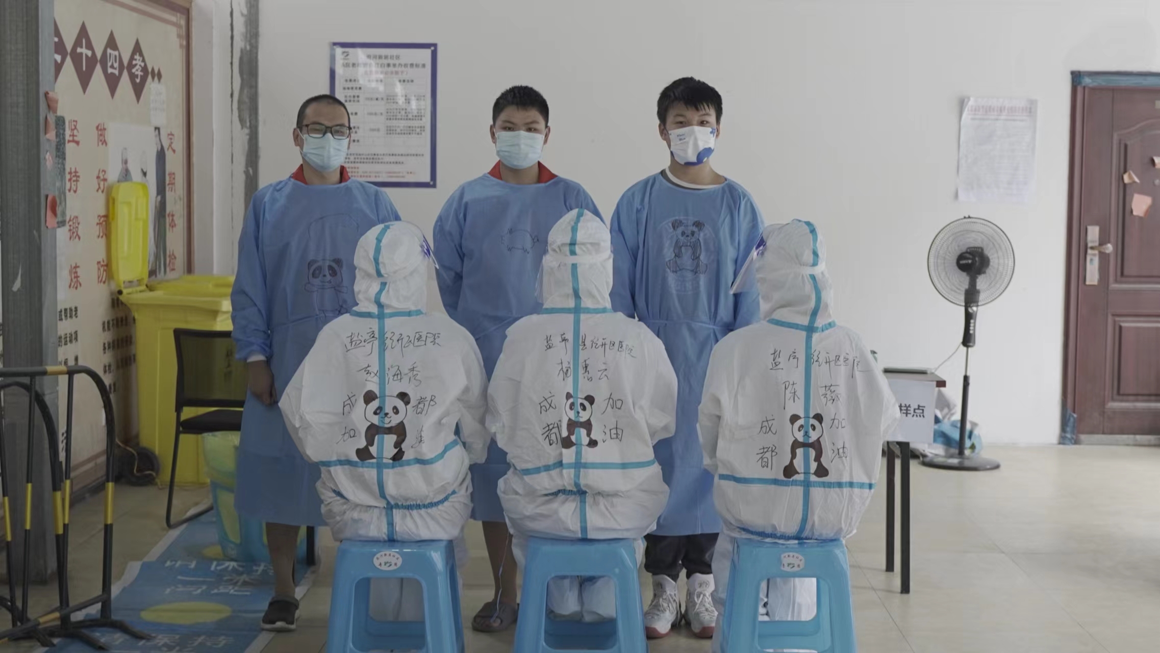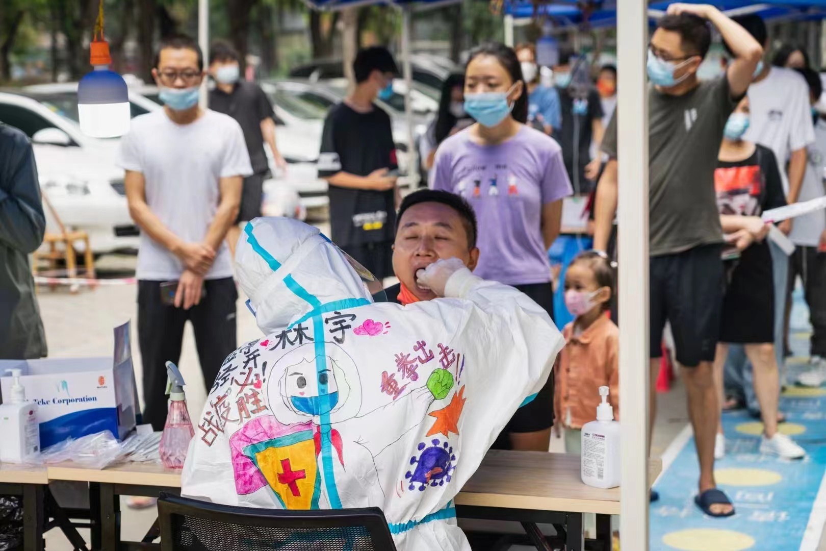 9月15日,在成都市金牛区西华街道核酸检测现场,“大白”们变身“彩妆大白”,给枯燥的核酸检测带来了新的气息。而这些灵魂画手,是来自西华街道辖区幼儿园的3名幼师——谢佳、刘欣、王思懿。