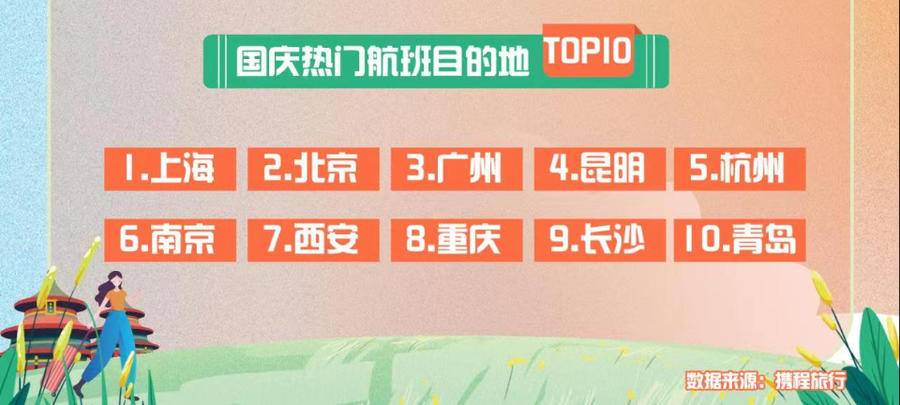 从长线游来看,今年国庆机票人均单价同比去年下降5%,相对中秋节机票价格增长约30%;今年国庆游客乘坐飞机的平均航班里程较去年减少3%,出行距离进一步缩短。国庆期间热门航班目的地前十名有:上海、北京、广州、昆明、杭州、南京、西安、重庆、长沙和青岛。