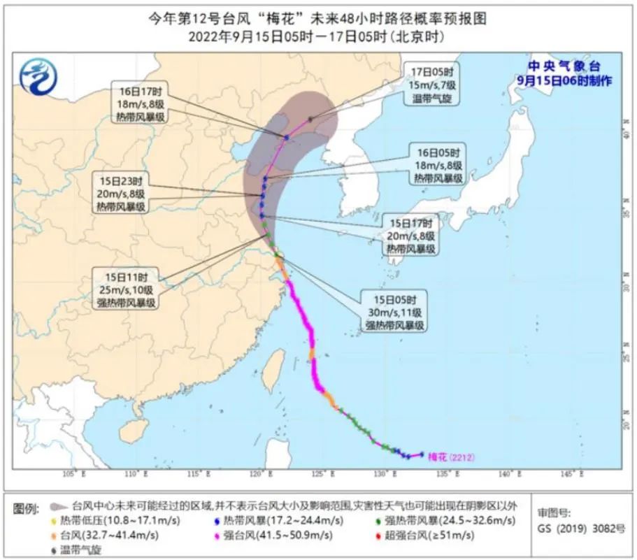 今年第12号台风“梅花”的中心今天早晨5时前移入江苏省,并减弱为强热带风暴级。预计,“梅花”将以每小时25~30公里的速度向北偏西方向移动,16日白天移入渤海海峡,并逐渐变性为温带气旋,17日从我省中部偏东区域穿过。
