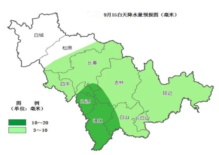 (1)受台风外围倒槽云系影响,15日白天,辽源、通化大部有中雨,降雨量10~20毫米,长春、四平、吉林、白山、延边和长白山保护区有小雨,降雨量3~10毫米;