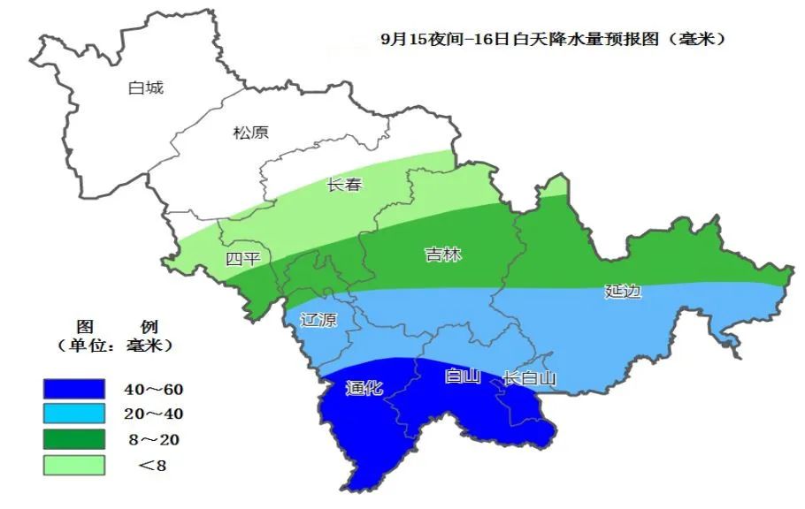 15日夜间到16日白天,通化南部、白山南部有大到暴雨,降雨量40~60毫米、局部70~90毫米,辽源、通化北部、白山北部、长白山保护区、延边南部有大雨,降雨量25~40毫米,四平东部、长春东南部、吉林南部、延边北部有小到中雨,降雨量8~25毫米。