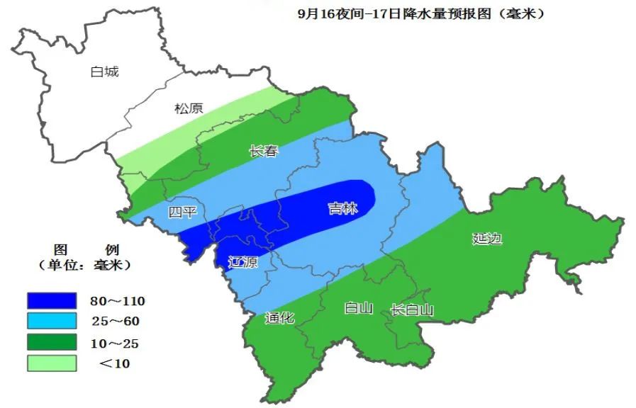 (2)受台风减弱为温带气旋北上影响,16日夜间到17日上午,四平东部、辽源、通化北部、长春东部、吉林大部、延边西北部有大到暴雨,降雨量25~60毫米,其中四平东部、长春东南部、辽源个别地方有大暴雨,最大降雨量可达110毫米左右。