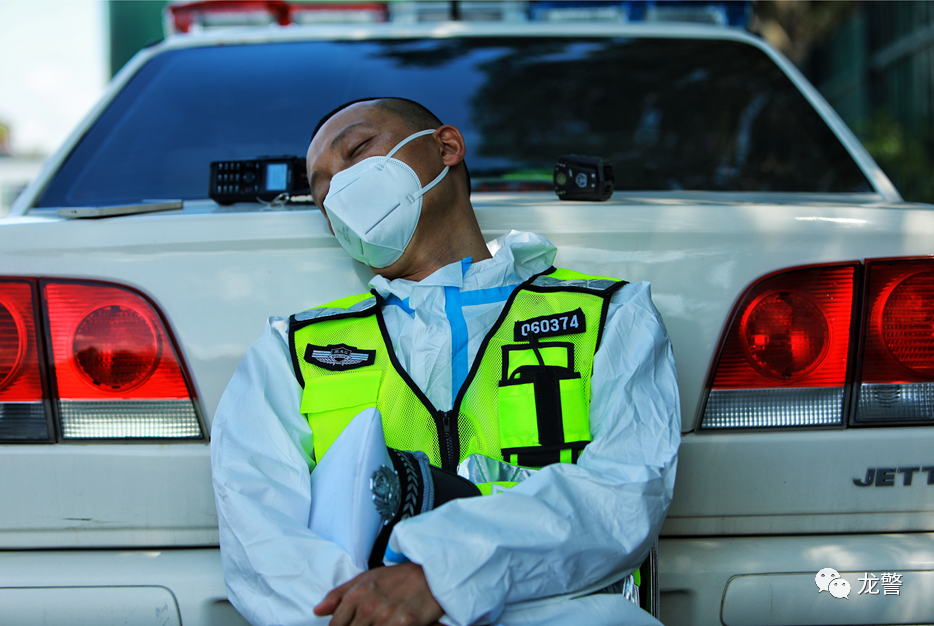 前一晚,修旭在卡口值守,一夜未眠。早晨在交接班过程中,准备轮换休息。用于休息的板房中,有同事正在睡觉,为了不打扰他们,修旭本想靠在车后歇一会儿,结果头一歪睡着了……