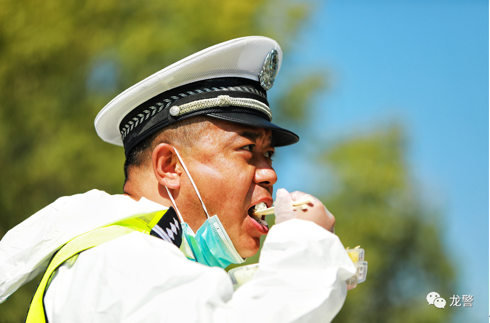 一手端着盒饭、一手用筷子将米饭送进口中……这张照片中的警察,是大庆市公安局交警支队让胡路大队教导员张猛。