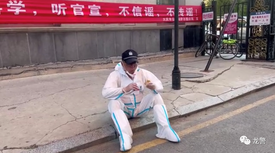 会战公安分局社区警务大队一级警长许凯,在萨尔图区九龙达小区出入口值守时,中午忙活完对自己严格按标准消毒后,开始吃盒饭,一同值守的同事,用手机拍下了这张照片。