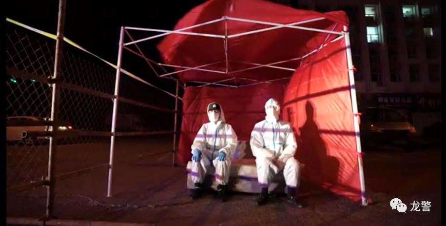 两名民警深夜在小区出入口值守。狂风冽冽,冷风袭人,简易帐篷被吹得不停摇晃。帐篷中,两人坚如磐石、岿然不动,他们身后,是万家梦境正酣时……