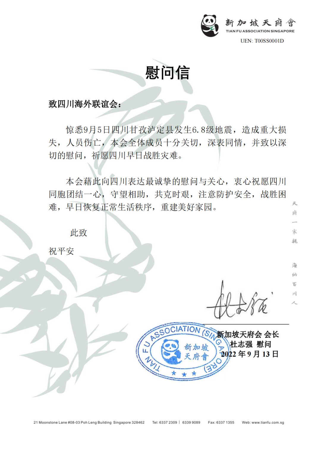 海外川籍侨团新加坡天府会第一时间响应四川海外联谊会倡议,会长杜志强亲自动员,从9月6日发起、并于9月9日截止,组织旅新海外侨胞122人捐赠资金211098元人民币支援抗震救灾;9月13日,新加坡天府会会长杜志强向四川海外联谊会发来慰问信,向家乡和灾区群众表达关心关切,并祝愿守望相助、共克时艰,早日恢复正常生活秩序、重建美好家园。