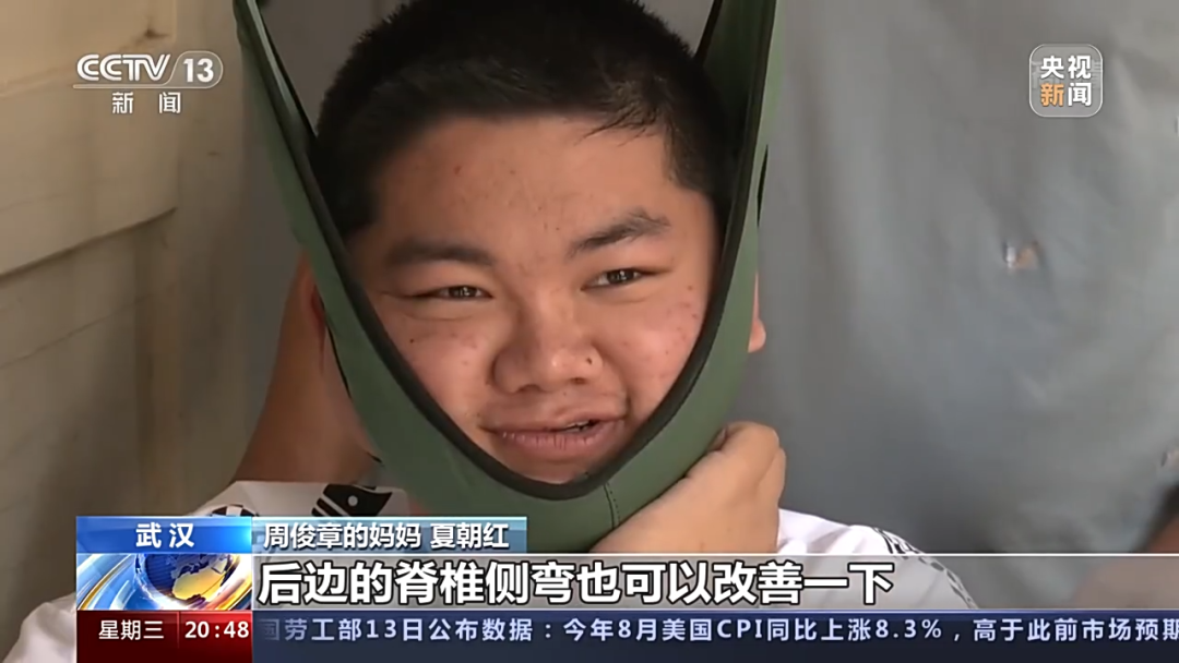 周俊章的母亲 夏朝红:牵引吊着他(头部),他的肺部能自由呼吸,后边的脊椎侧弯也可以改善一下。