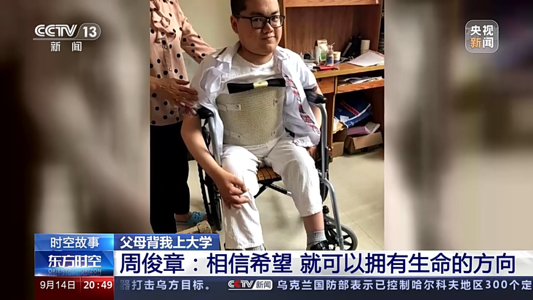 新学期,在中国地质大学(武汉)报到的学生中,有一位新生名叫周俊章。因为身患脊髓性肌萎缩症,周俊章无法独立行走,十多年来,是父母背着他上学,从小学,到中学,如今迈入了大学的校门。