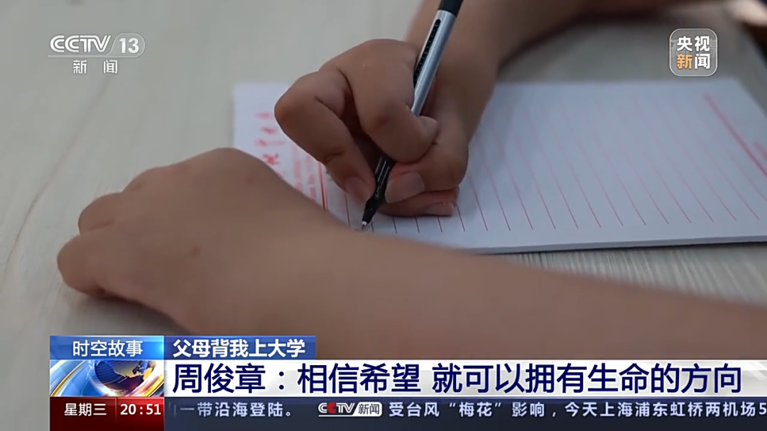 2019年,周俊章以优异的成绩考上了高中。在高中三年的1000多个日夜里,周俊章每天早晨5点50分出门,晚上9点30分回家,在教室一坐就是十几个小时,用他那只有微弱力气的右手记笔记、做作业……