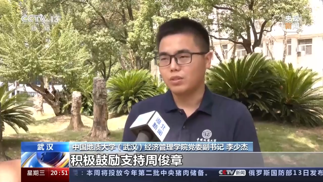 中国地质大学(武汉)经济管理学院党委副书记 李少杰:学院现在正在筹建一个帮扶小组,会一直跟踪和帮助周俊章的学习生活,积极鼓励支持周俊章去申报这些奖助体系。