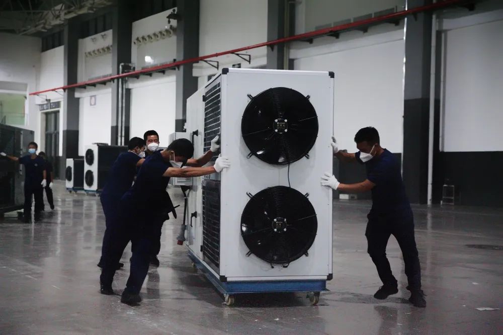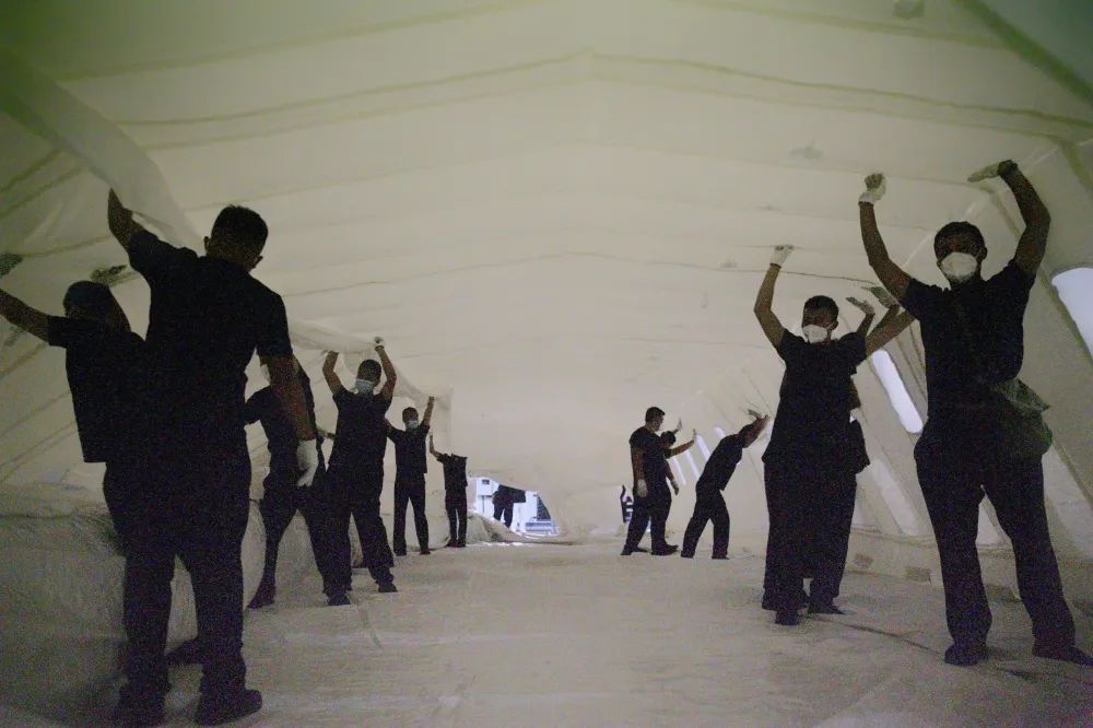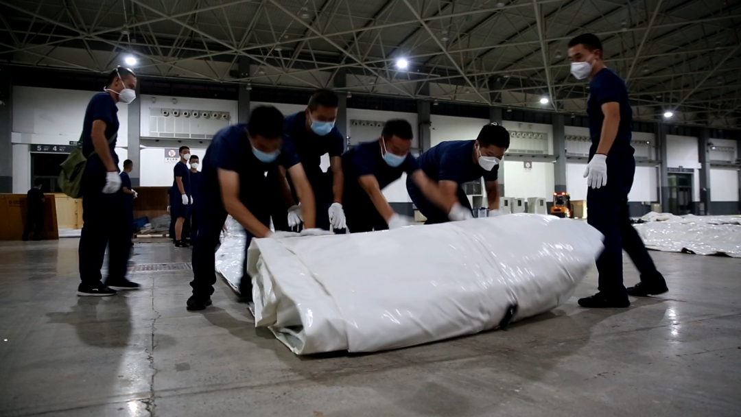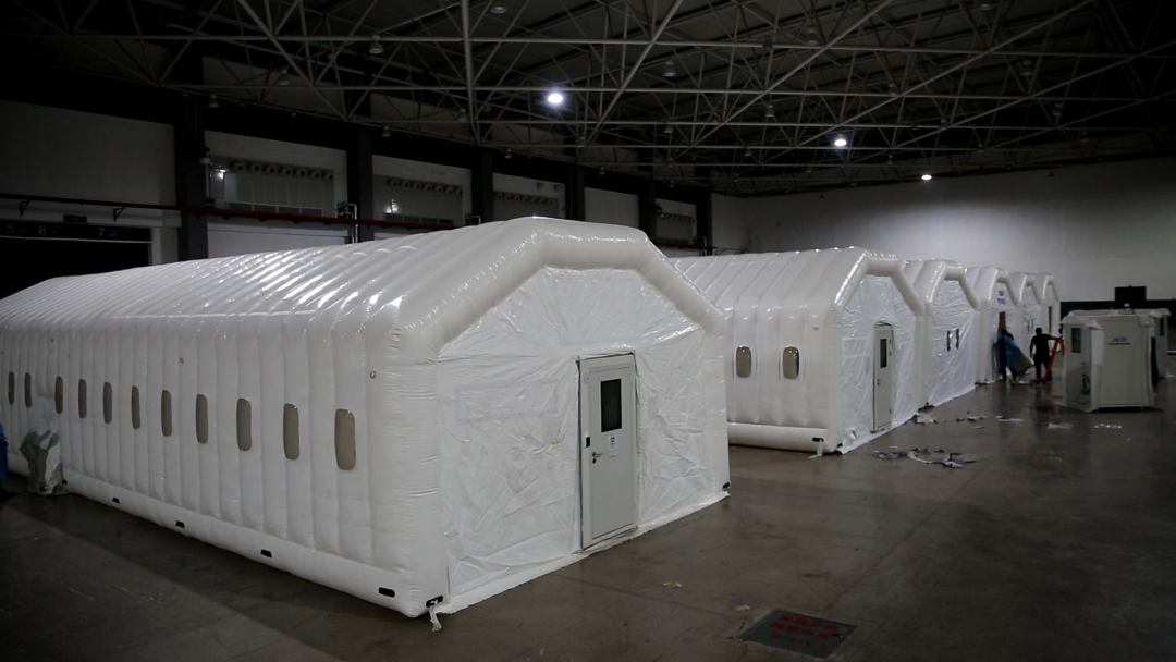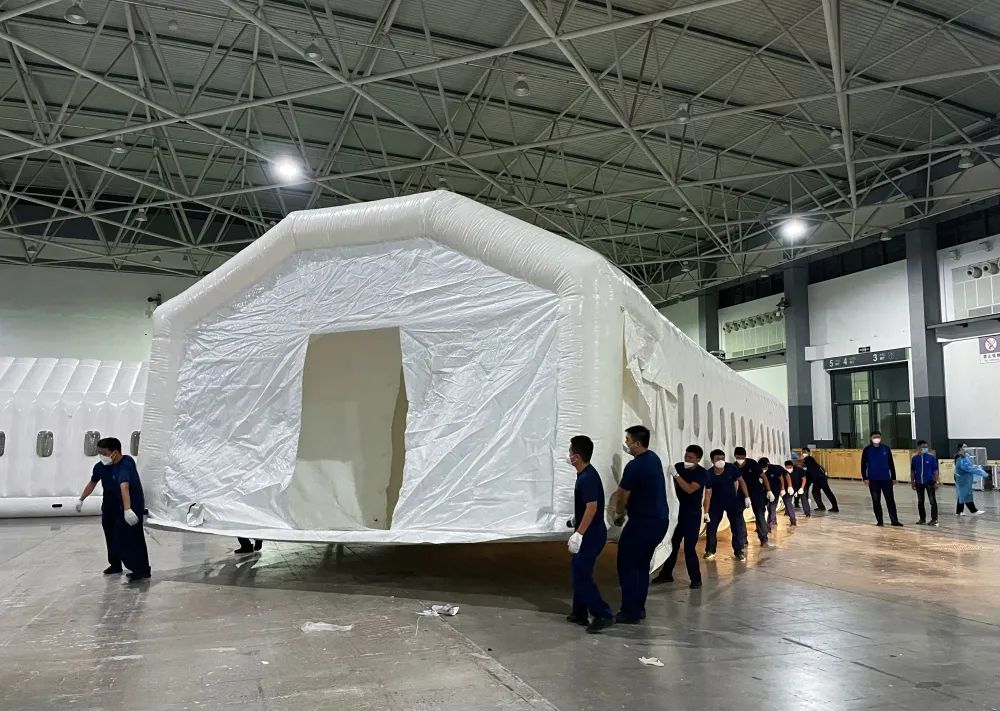 (消防员正在合力搭建充气型气膜方舱实验室)