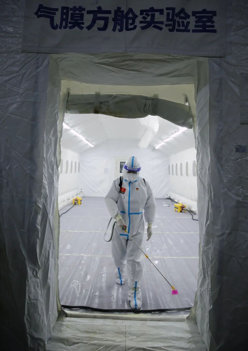 每个气膜核酸实验室由6个气膜移动实验舱组成,观山湖消防抗疫服务机动队在现场专业人员的指导下,全体队员分工协作、有条不紊,细致且高效的完成了场地规划、设备进场、布置安装、气膜充气、设备调试等各项工作,并对实验方舱进行消杀,最大限度为实验室早日投入使用争取了宝贵的时间。