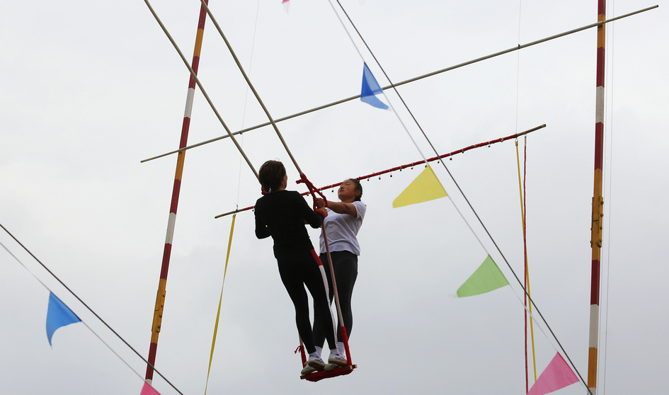 9月14日下午,新疆维吾尔自治区第十届少数民族传统体育运动会秋千项目55公斤以上级双人触铃比赛开赛,惊险刺激的比赛场景引得欢呼声不断。