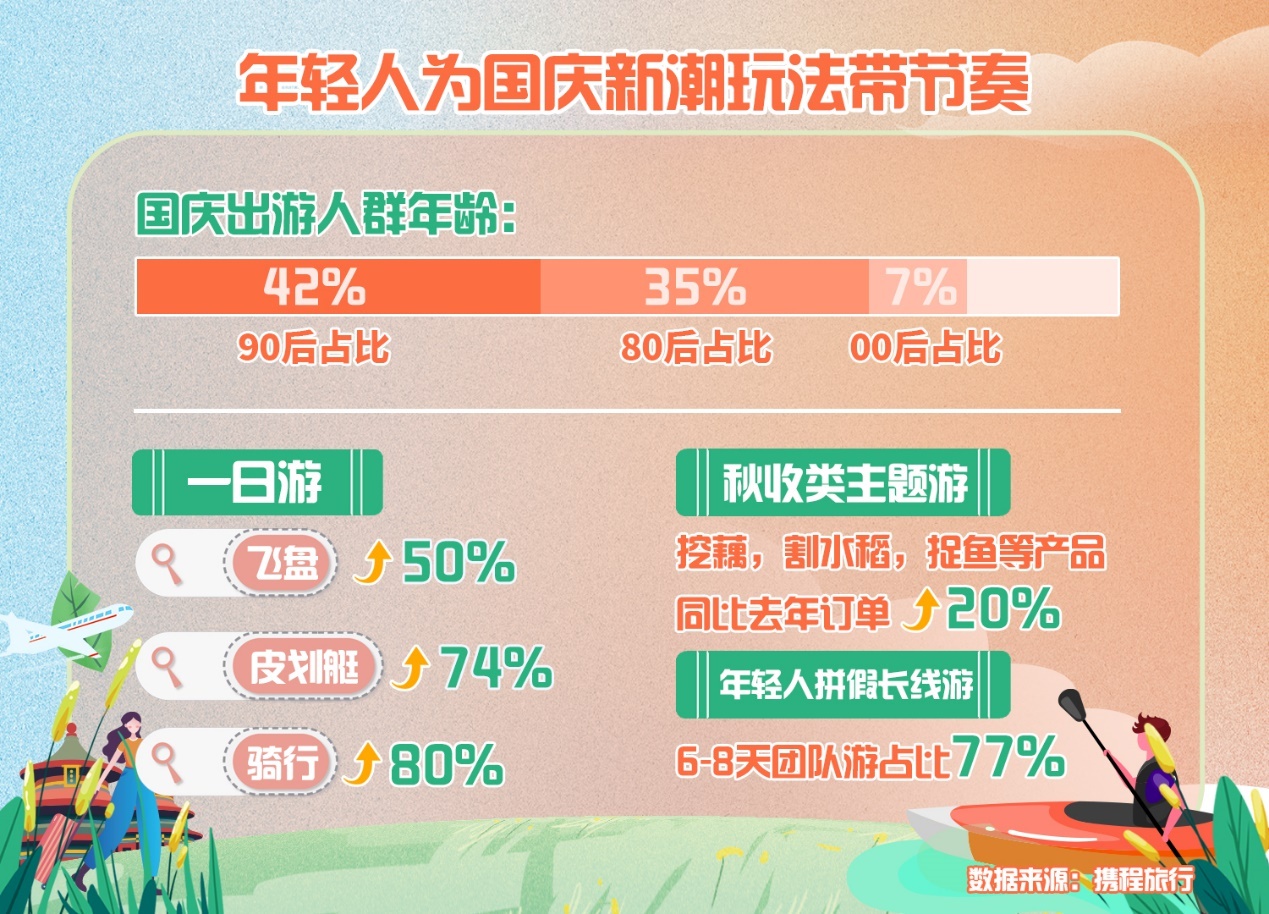 年轻人还催热了市内各种新型的户外活动,特别是飞盘、骑行、尾波冲浪、皮划艇、腰旗橄榄球等潮流运动刷爆眼球。携程一日游及时推出新潮玩法的产品,近期飞盘、皮划艇、骑行一日游产品的搜索热度分别增长50%、74%和80%。主题游还上线了各种秋收类产品,如挖藕,割水稻,捉鱼等秋季体验产品。