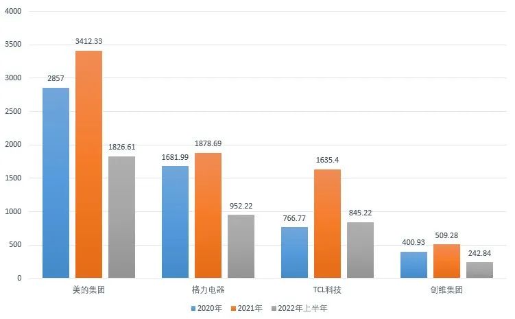 以2021年为节点,营收首次迈上三千亿元平台的美的集团,在四家企业中体量最大;格力电器整体规模将近两千亿元,位列第二;将消费电子业务分离独立上市,以半导体显示为主营业务的TCL科技近年来营收增速最快,超过50%;创维集团营收则呈平稳小幅增长态势。