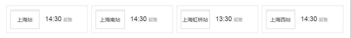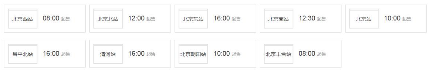 以北京和上海的火车票起售时间为例。铁路12306网站显示,北京西站起售时间最早,为上午8时;北京站、北京朝阳站上午10时起售;北京北站12时起售;北京南站12时30分起售;北京东站、昌平北站、清河站起售时间均为16时。上海各站的起售时间则均为下午,其中上海虹桥站13时30分起售,上海站、上海南站和上海西站则在14时30分起售。