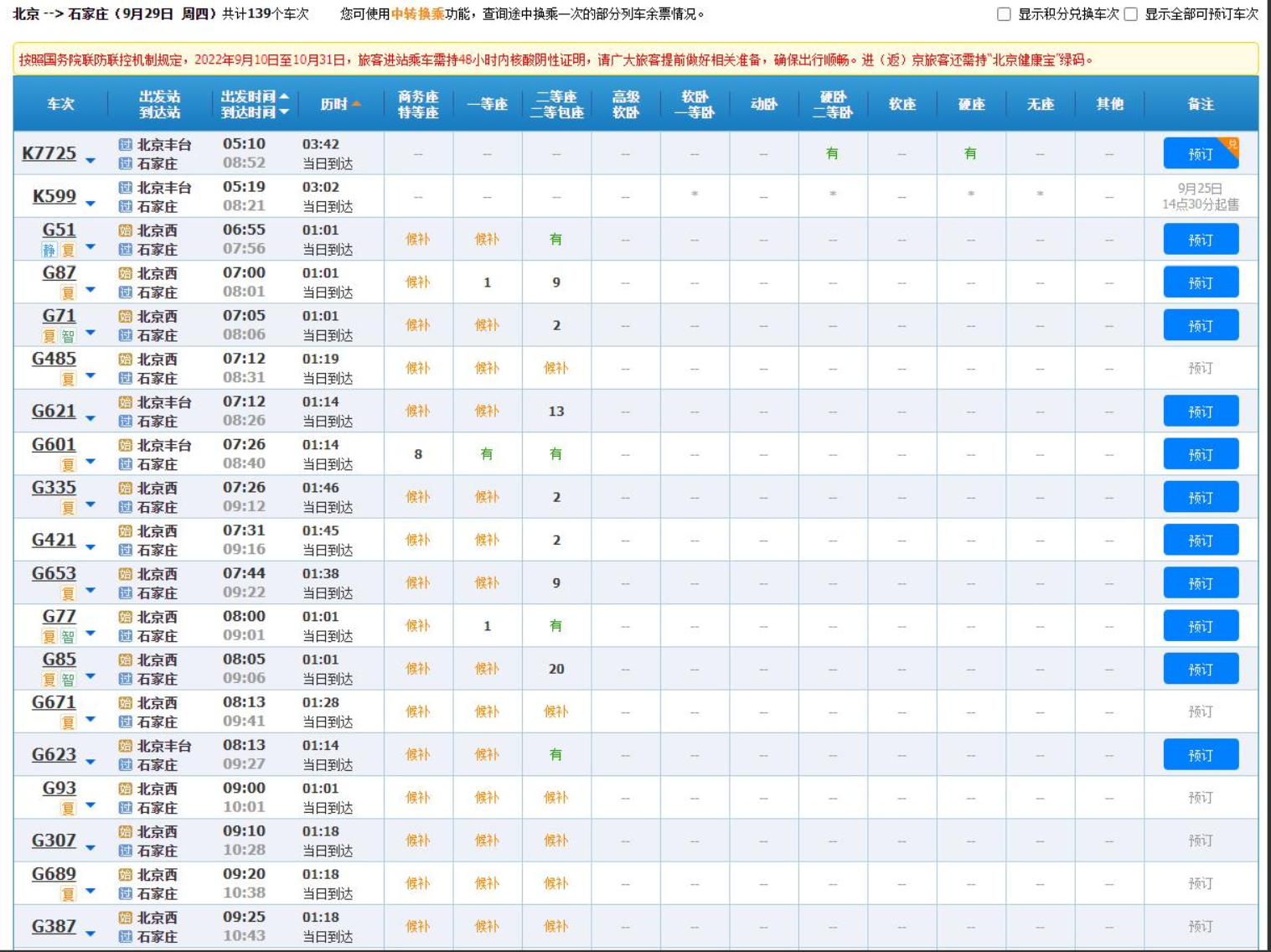 9月29日北京至石家庄部分车次余票情况。图片来源:铁路12306网站,下同