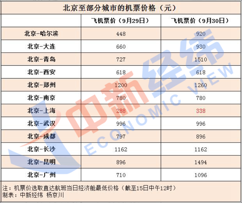 从飞机票价来看,9月29日多数航线的最低价格低于30日。其中29日北京至哈尔滨、青岛的机票最低价较30日便宜约五成,29日北京飞往大连、昆明和广州的机票最低价也较30日有较大幅度的下降;但29日和30日北京飞往南京、武汉和长沙的机票最低价则没有变化。