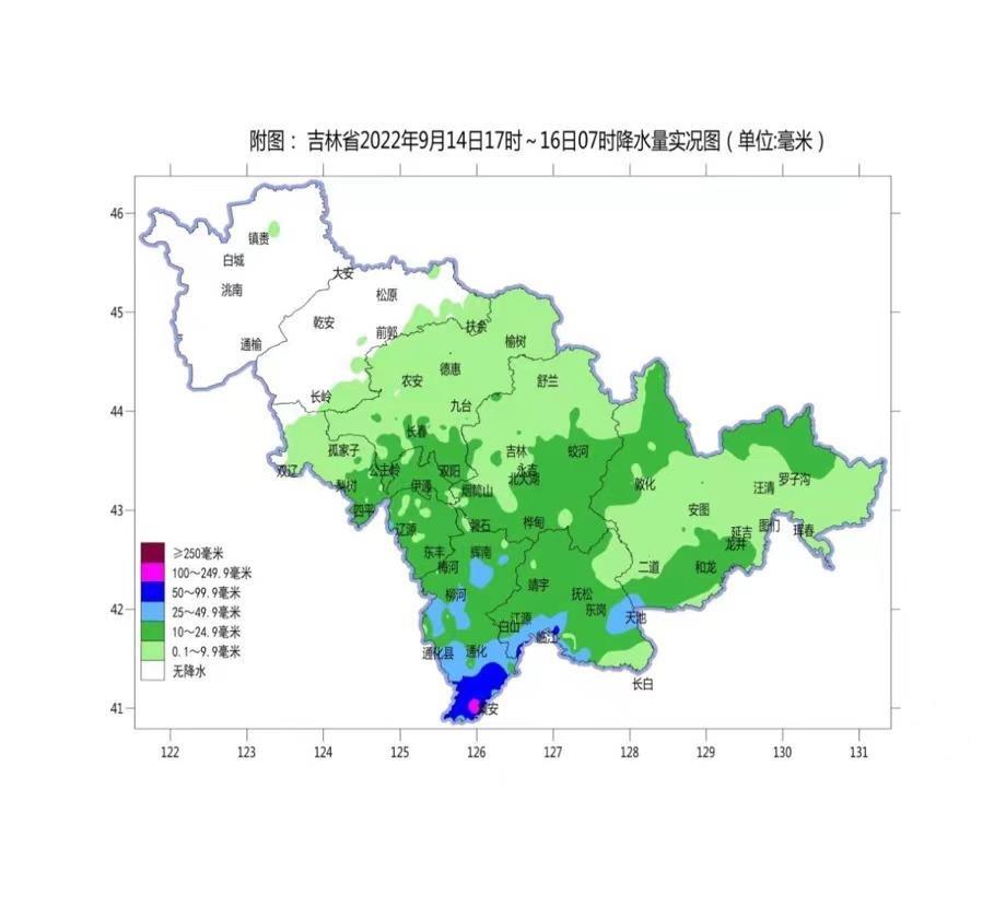 截至16日7时,吉林全省平均降水量11毫米,地区分布:通化33.6毫米,白山19.9毫米,长白山保护区19.3毫米,辽源18.2毫米,四平10.6毫米,延边9.6毫米,吉林9.4毫米,长春6.2毫米,其他地区不足2毫米。