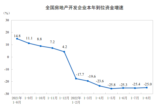 数据显示,今年1-8月份,全国房地产开发投资90809亿元,同比下降7.4%;商品房销售面积87890万平方米,同比下降23.0%;商品房销售额85870亿元,下降27.9%。8月份,全国70个大中城市中,新房价格环比下跌的城市增至50个,二手房价格环比下跌的城市增至56个。