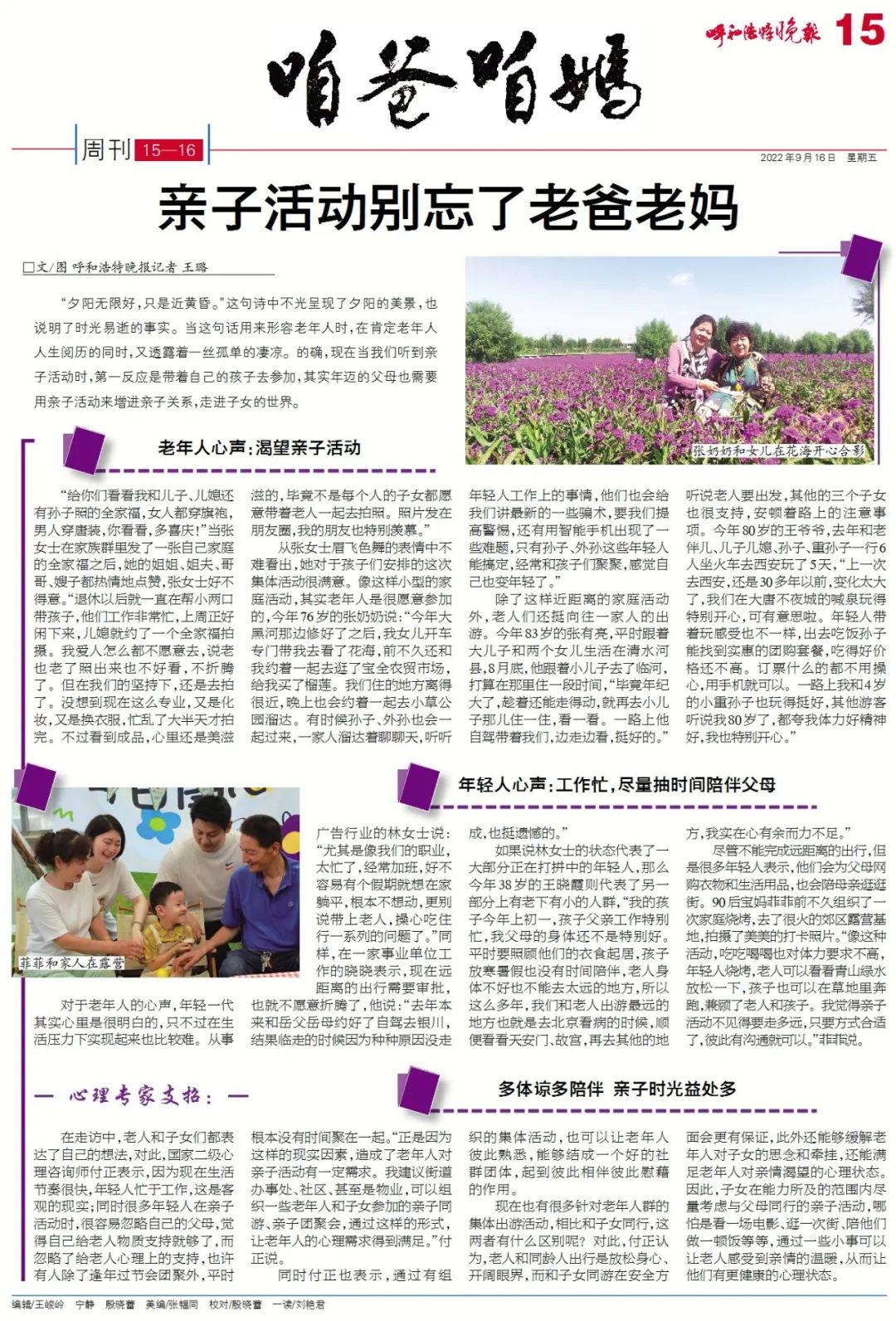 在走访中,老人和子女们都表达了自己的想法,对此,国家二级心理咨询师付正表示,因为现在生活节奏很快,年轻人忙于工作,这是客观的现实;同时很多年轻人在亲子活动时,很容易忽略自己的父母,觉得自己给老人物质支持就够了,而忽略了给老人心理上的支持,也许有人除了逢年过节会团聚外,平时根本没有时间聚在一起。“正是因为这样的现实因素,造成了老年人对亲子活动有一定需求。我建议街道办事处、社区、甚至是物业,可以组织一些老年人和子女参加的亲子同游、亲子团聚会,通过这样的形式,让老年人的心理需求得到满足。”付正说。