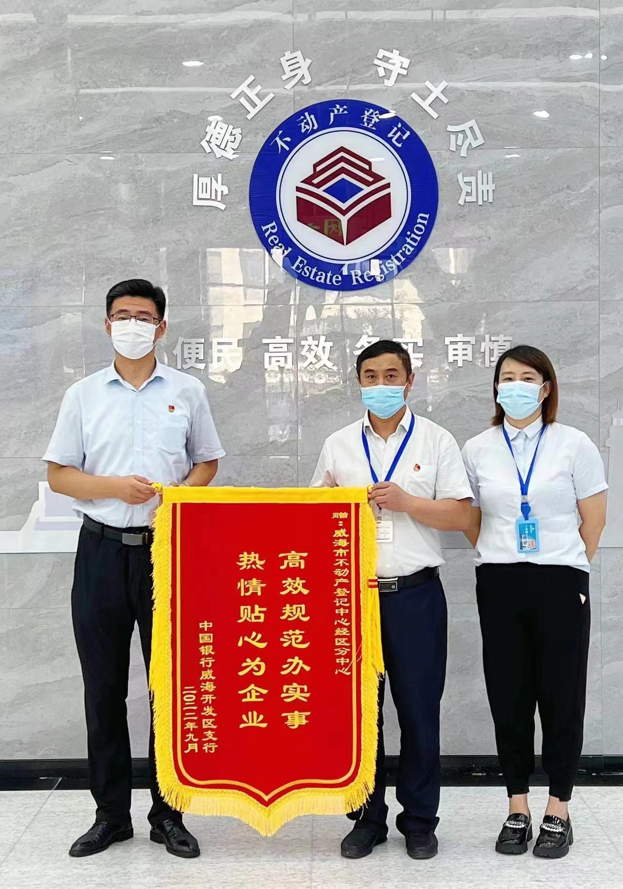9月7日,中国银行威海开发区支行行长姜杰将一面绣有“高效规范办实事,热情贴心为企业”字样的锦旗送到威海市不动产登记中心经区分中心负责人手中,表达对分中心务实高效服务的谢意。姜杰现场表示:“近期我行不动产抵押贷款业务较多,办理抵押登记的时间反而大大减少了,不动产部门的创新举措真正为企业解决了大问题,真心地感谢你们。”