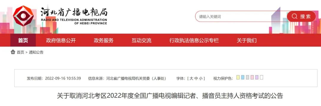 9月16日,河北广播电视局发布最新公告,取消河北考区2022年度全国广播电视编辑记者、播音员主持人资格考试