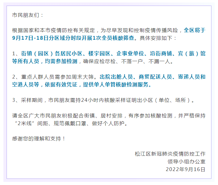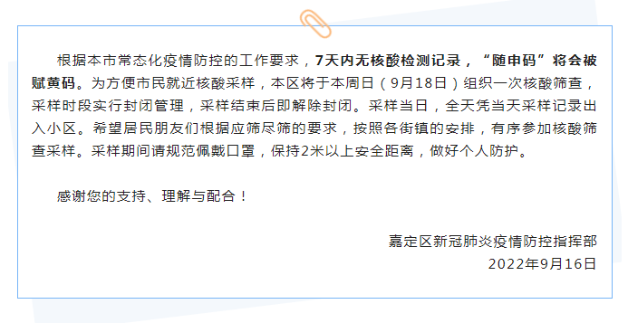 一、全体市民按照应检必检要求,完成全员核酸检测。请按所在街道(镇)、社区(村)、小区(院落)或工作单位通知,分时段有序参加核酸检测并做好个人防护。对未按要求参加核酸检测人员实施赋码管理。