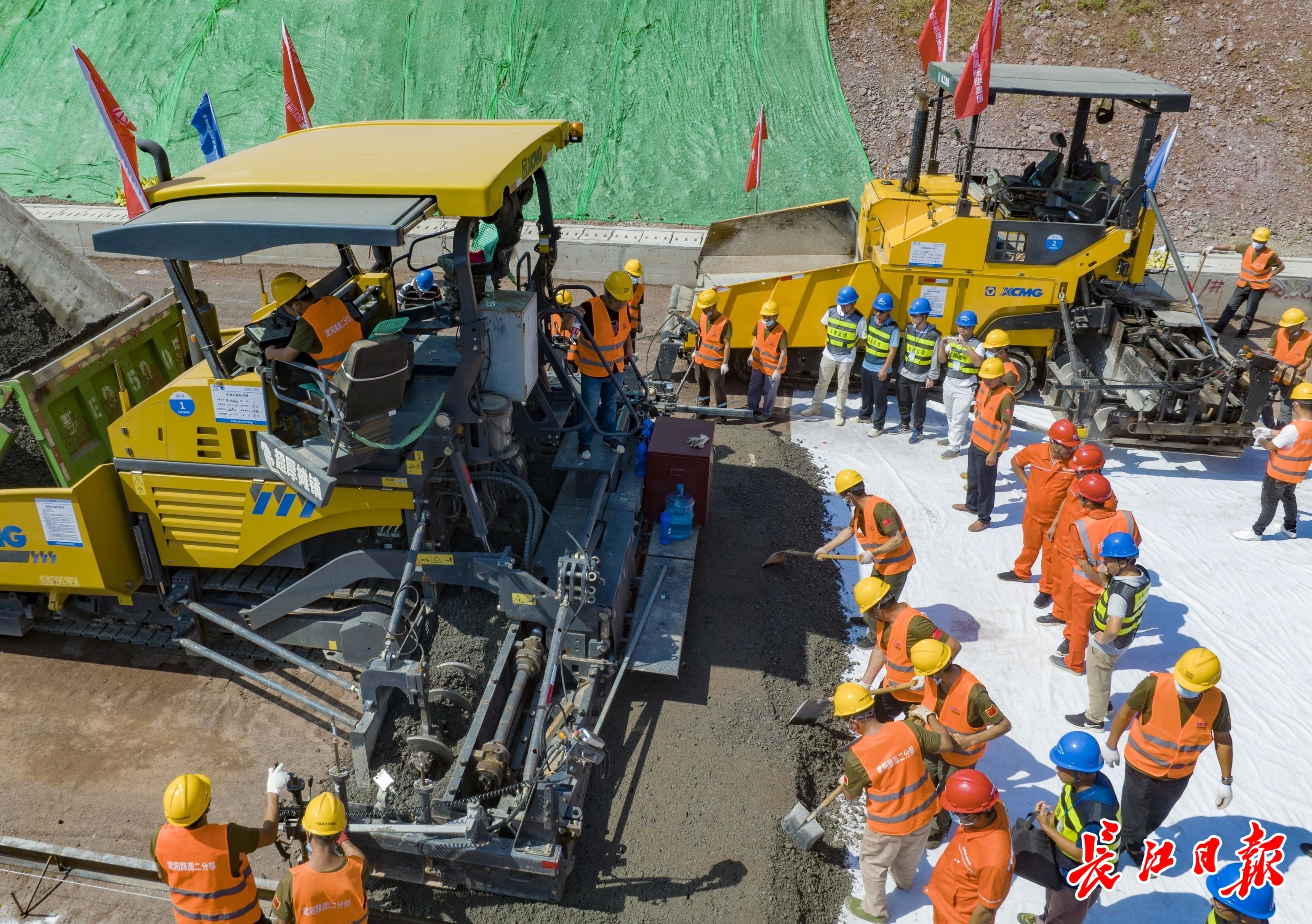 路面工程施工正式开始前,施工单位中国能建葛洲坝路桥公司所属市政公司举办了路面底基层摊铺试验观摩会,旨在发挥工程首件制的示范引领作用,强化标准化作业。此次试验段从16日上午10时开始,作业持续两个半小时。试验段长度370米、宽度12.35米、厚20厘米,水稳混合料约2115吨。通过两种施工工艺的相互印证,检验施工方案和施工方法的适用性,检验和确认施工中各道工序的质量控制指标,获得大面积施工的各项技术参数。