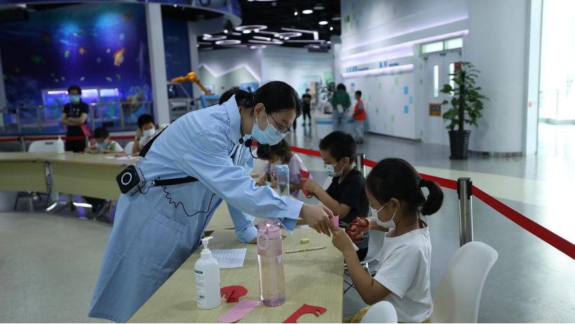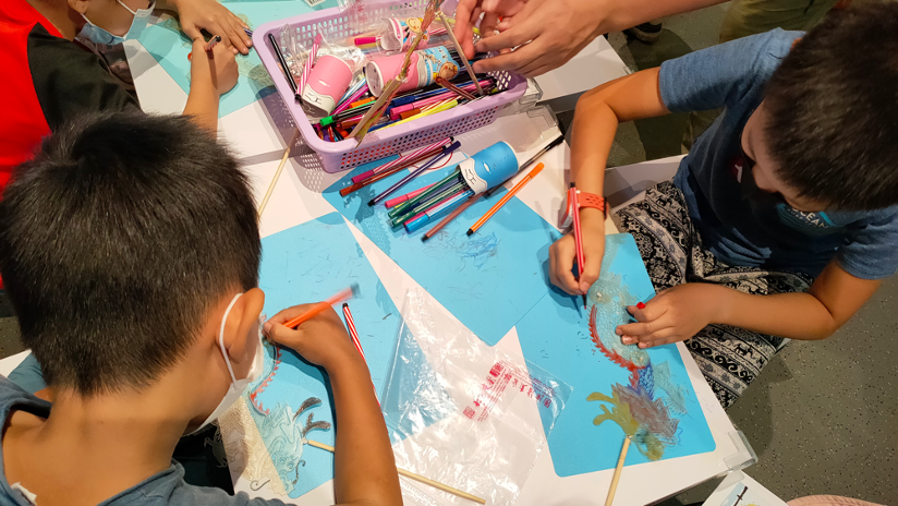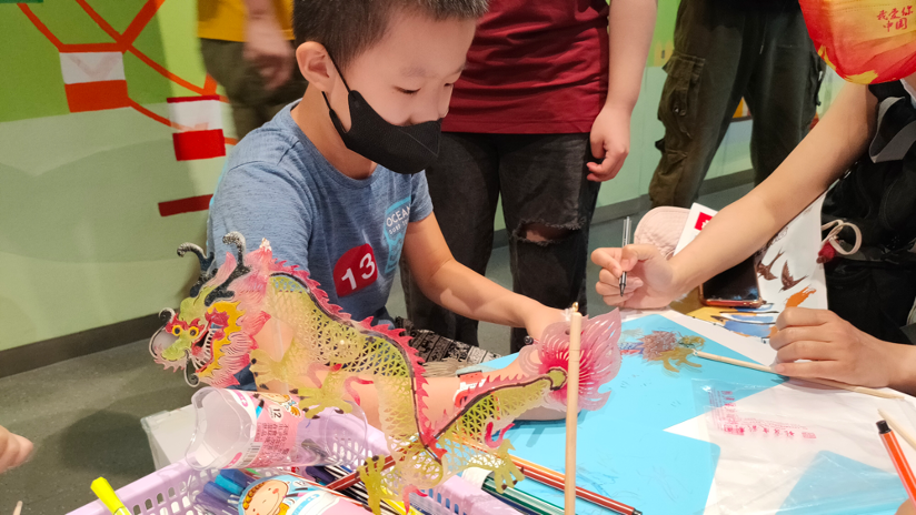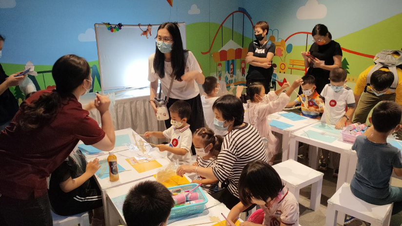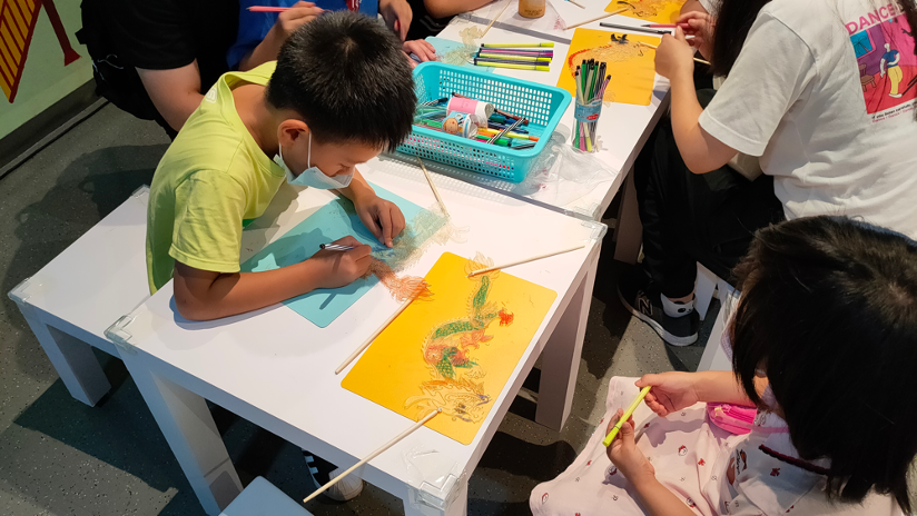 在北京科学中心儿童馆(4号楼)三层小剧场聚集了众多前来体验皮影DIY的小朋友,现场氛围十分欢乐。