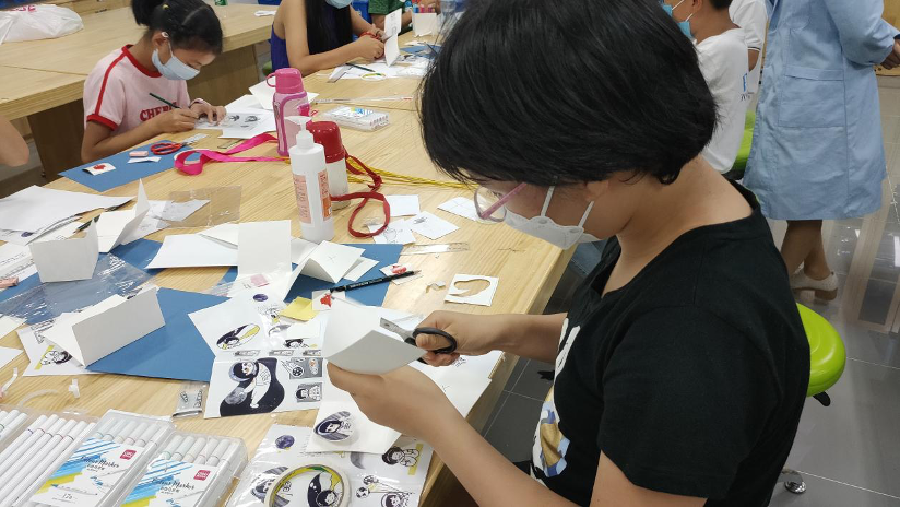 活动现场为大家准备了丰富的创意贴纸和剪裁工具,孩子们认真地构思有趣新颖的故事,并通过把一张张贴纸粘贴在立体卡片上,展现自己的巧思。