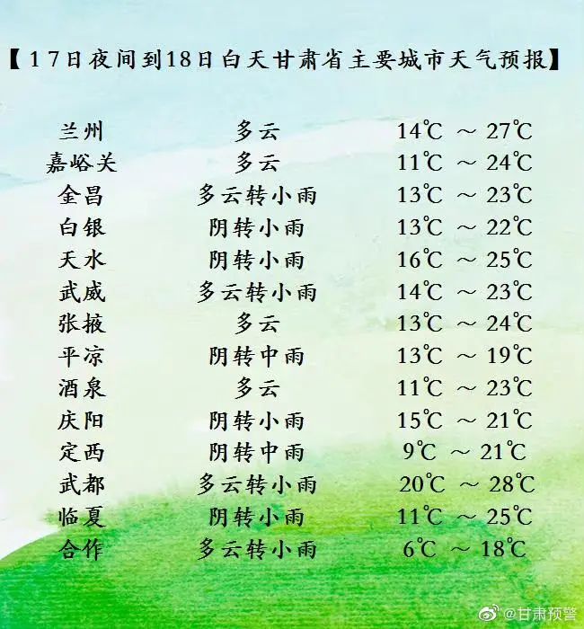 今天夜间到明天白天,张掖、金昌、武威、兰州、白银、临夏、甘南等市州多云转阴,部分地方有小雨;定西、陇南、天水、平凉、庆阳等市多云,局部地方阴有阵雨或小雨;酒泉、嘉峪关两市多云,有4-5级偏东风。另外,明日清晨庆阳市部分地方有雾。