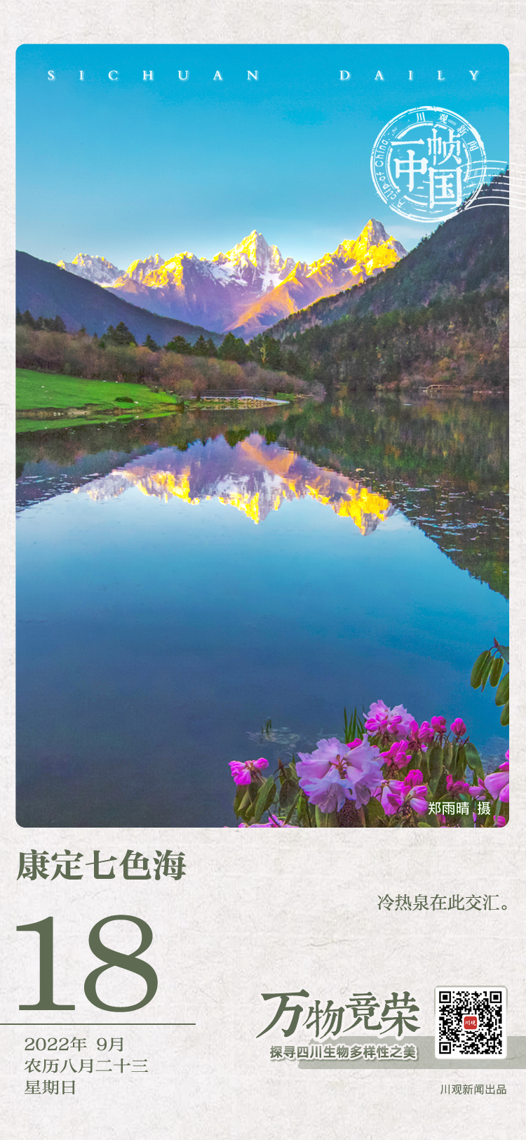 七色海是一处湖水与温泉交融的高原湖泊,面积约20公顷,水深20余米。清澈的湖水倒映着岸边的林木和天上的白云,所呈现出来的五彩斑斓的画面之美,不输九寨沟。环湖览胜,“莲花雾绕”“莲花夕照”“驼峰倒影”等佳景,更能衬托出七色海自然的灵趣。