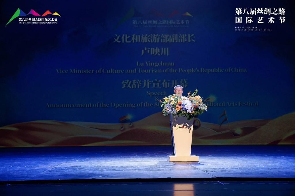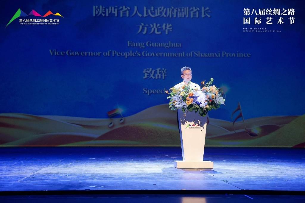 卢映川在致辞中指出,丝绸之路国际艺术节创立八年以来,规模不断扩大、内涵不断丰富、社会效益日益彰显,已成为具有重要国际影响力的文化品牌活动。希望丝绸之路国际艺术节以明年纪念共建“一带一路”倡议提出十周年为契机,继续推陈出新,不断超越,为推动共建“一带一路”、构建人类命运共同体作出更大贡献。方光华在致辞中说,陕西将以本届艺术节为新的起点,在文化和旅游部的指导支持下,进一步发挥陕西历史底蕴、文化特色、区位优势,积极融入“一带一路”大格局,讲好陕西故事,凝聚文化共识,为共建“一带一路”贡献文化艺术力量。