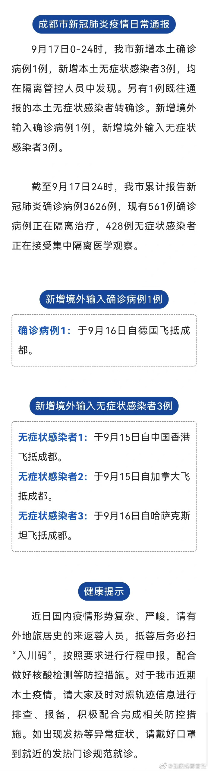 9月17日0-24时,我市新增本土确诊病例1例,新增本土无症状感染者3例