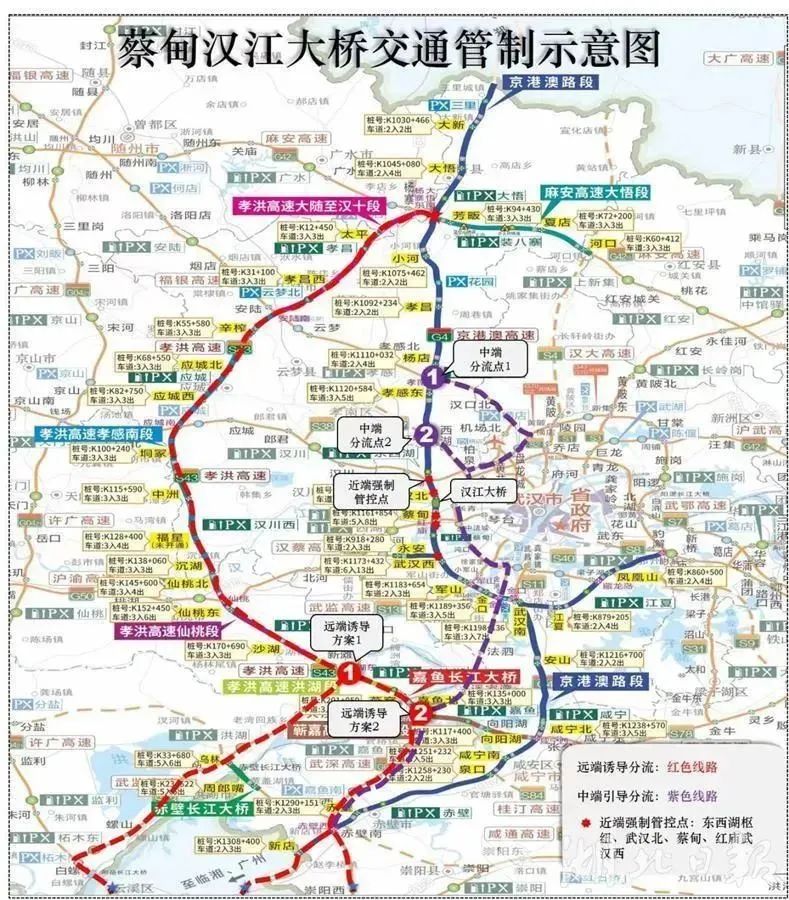 近端强制管控方案:在武汉西枢纽互通设置强制管控点,通过现场管制方式强制通行京港澳高速(G4)的北上货车经东风大道绕行四环线(S40)北上通行;在蔡甸互通设置强制管控点,通过现场管制方式强制通行京港澳高速(G4)的北上货车经汉蔡高速(S15)绕行四环线(S40)北上通行。