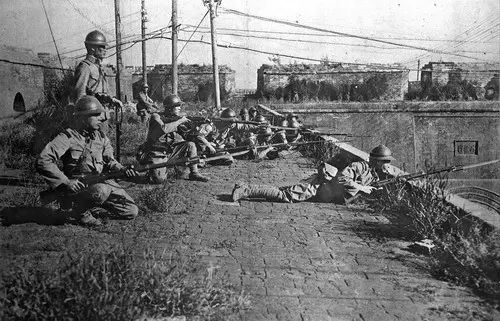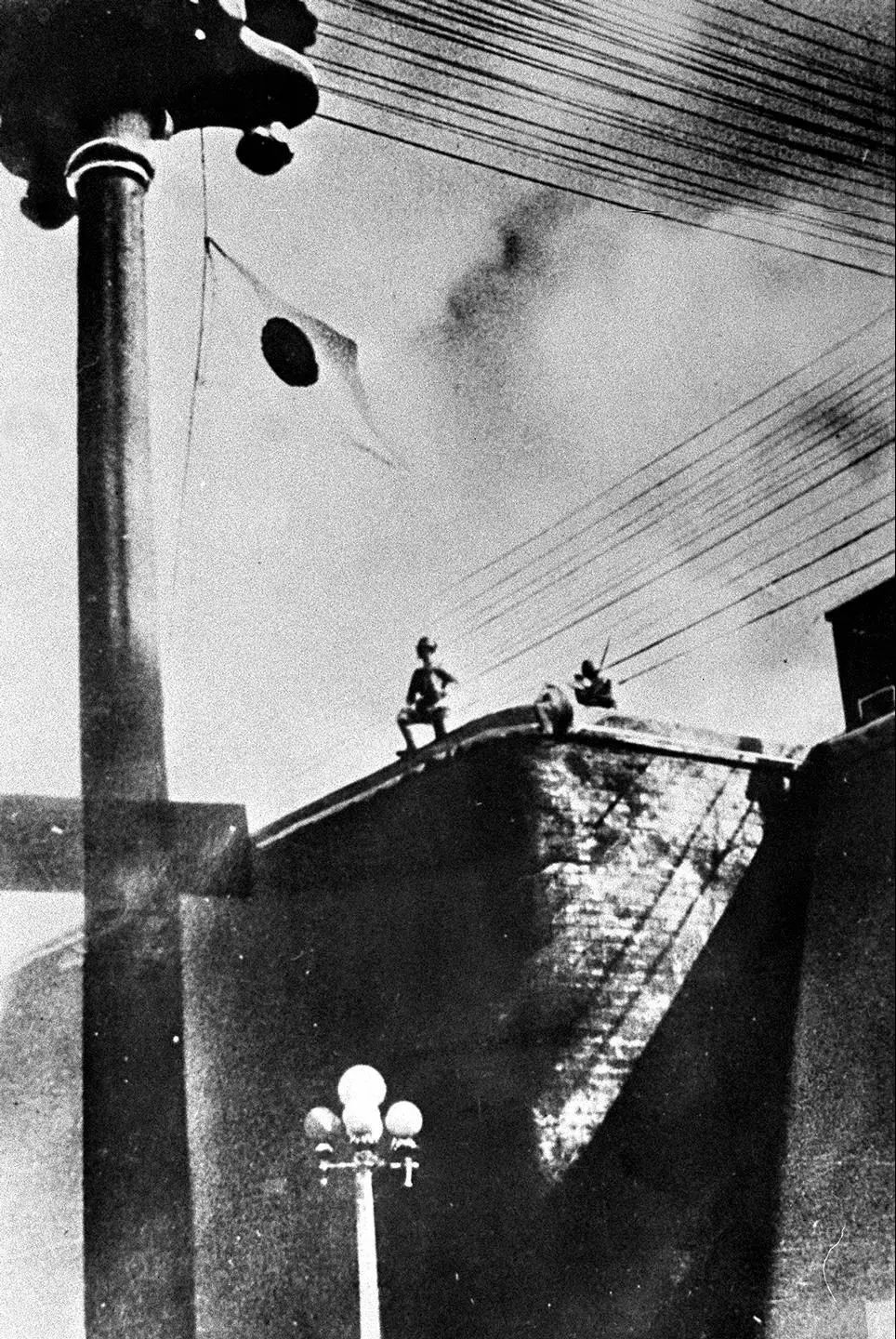 日军侵占沈阳城后,耀武扬威地站在城头,悬挂起日本国旗。