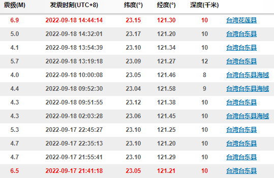 9月18日14时44分在台湾花莲县(北纬23.15度,东经121.30度)发生6.9级地震,震源深度10千米。