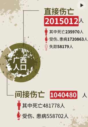 据统计,在日军入侵期间,广西直接伤亡超过200万人,其中死亡近24万人;间接伤亡超过100万人,其中死亡48万多人。