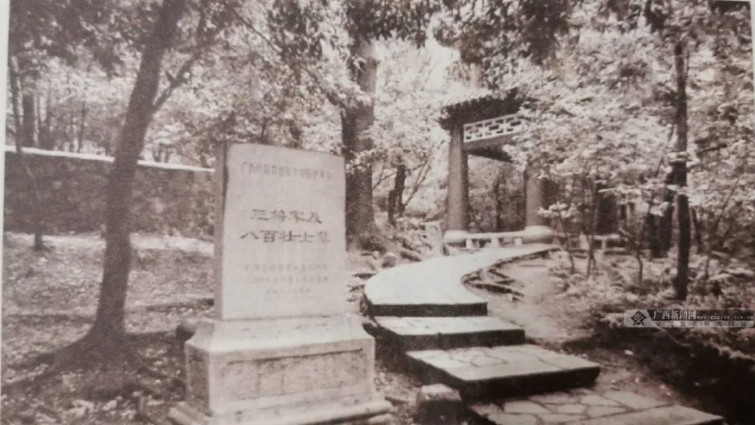 1944年11月7日,日军向桂林七星岩中国守军阵地发起攻击,将毒气弹投入岩中,824名中国官兵壮烈牺牲。图为三将军(桂林城防司令部参谋长陈济桓、陆军第131师师长阚维雍、陆军第31军参谋长吕旃蒙)及八百壮士墓墓碑。广西壮族自治区档案馆供图