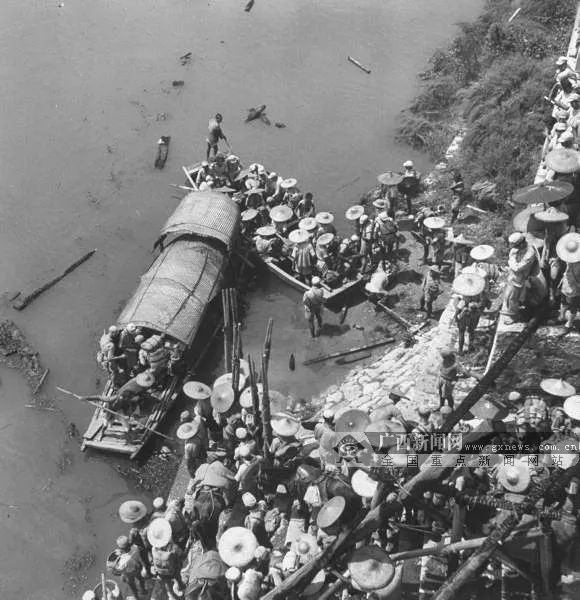图为1945年8月,一队士兵和民伕在桂林漓江岸边,准备从水路追击日军。广西壮族自治区档案馆供图