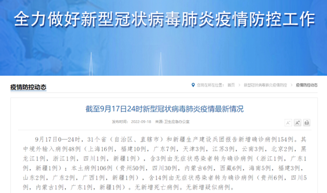 9月17日0—24时,31个省(自治区、直辖市)和新疆生产建设兵团报告新增确诊病例154例。其中境外输入病例48例(上海16例,福建10例,广东7例,天津3例,江苏3例,云南3例,北京2例,黑龙江1例,浙江1例,四川1例,新疆1例),含3例由无症状感染者转为确诊病例(浙江1例,广东1例,新疆1例);本土病例106例(贵州50例,四川30例,内蒙古6例,西藏6例,海南5例,福建3例,山东2例,广东2例,广西1例,新疆1例),含14例由无症状感染者转为确诊病例(贵州6例,四川5例,内蒙古1例,广东1例,新疆1例)。无新增死亡病例。无新增疑似病例。
