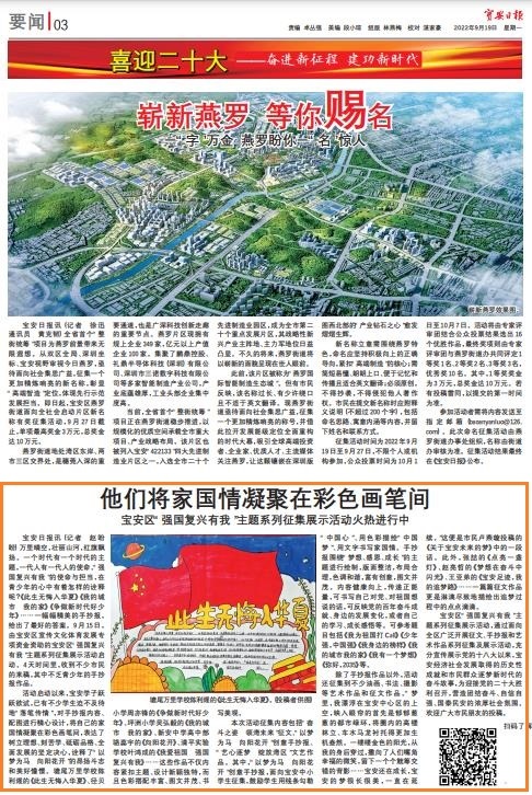宝安区“强国复兴有我”主题系列征集展示活动,通过面向全区广泛开展征文、手抄报和艺术作品系列征集及展示活动,充分宣传展示党的十八大以来,宝安经济社会发展取得的历史性成就和市民群众逐梦新时代的奋斗故事,为迎接党的二十大胜利召开,营造团结奋斗、自信自强、国泰民安的浓厚社会氛围。欢迎广大市民朋友的投稿。