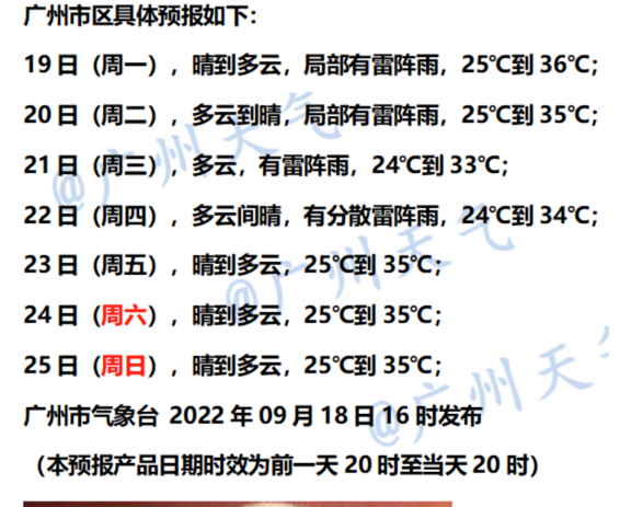 广州市区,19日,晴到多云,局部有雷阵雨,气温介于25℃到36℃之间;20日,多云到晴,局部有雷阵雨,气温介于25℃到35℃之间;21日,多云,有雷阵雨,气温介于24℃到33℃之间。