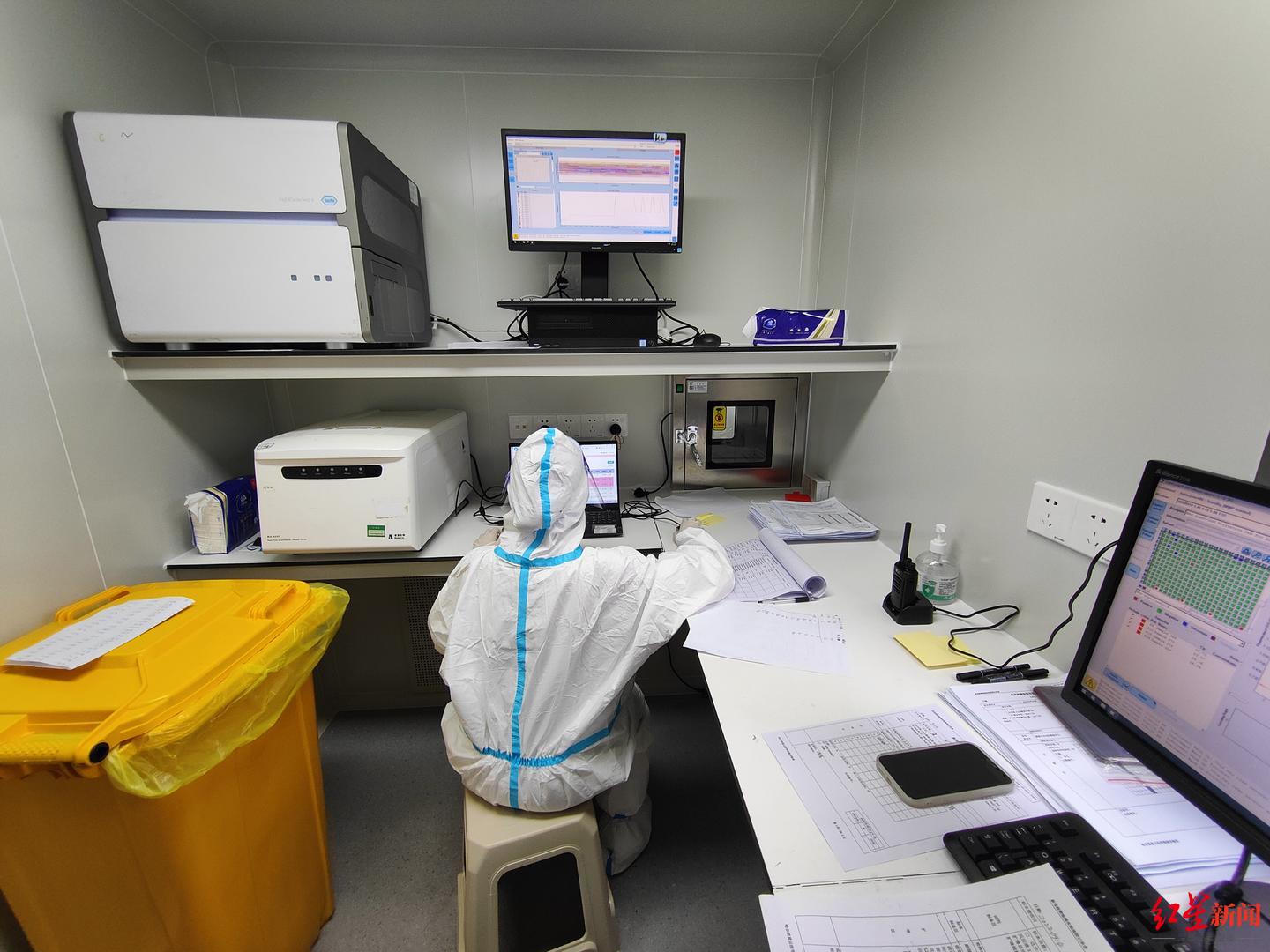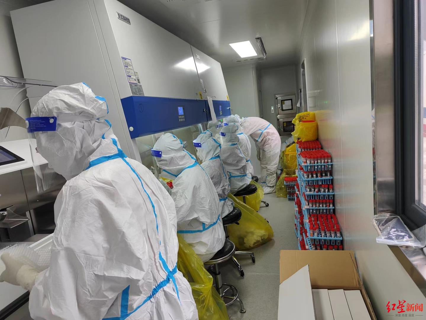 在妻子的鼓励下,当天下午6点,余秋岑驾车带着三个同事从重庆出发了。夜里12点,和余秋岑一样来自重庆的另外47位检测员陆续赶到成都市双流区一酒店落脚。放下行李后,大家马上投入到工作中,方舱放置、人员培训等一系列工作完成后,次日早上,双流区的核酸样本检验工作正式开展起来。