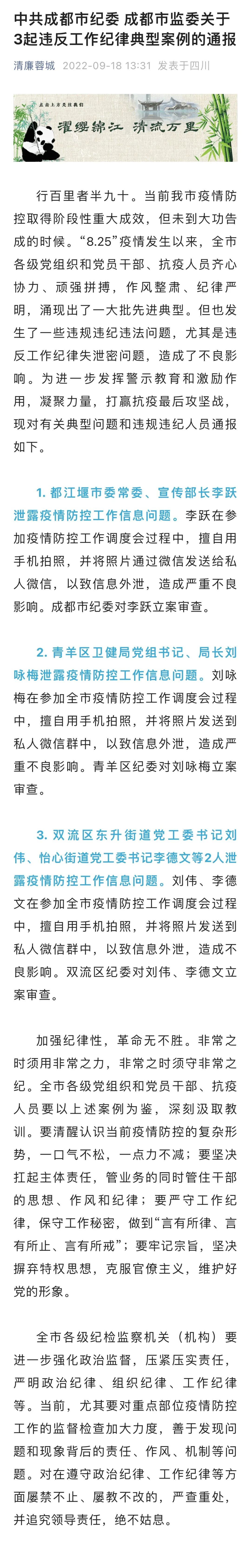“清廉蓉城”18日发布《中共成都市纪委 成都市监委 关于3起违反工作纪律典型案例的通报》。其中通报了都江堰市委常委、宣传部长李跃,青羊区卫健局党组书记、局长刘咏梅等4人泄露疫情防控工作信息问题。