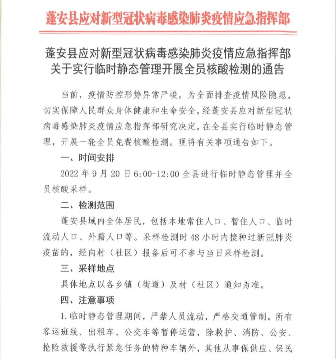 9月18日,四川省南充市蓬安县应对新型冠状病毒感染肺炎疫情应急指挥部发布关于实行临时静态管理开展全员核酸检测的通告。为全面排查疫情风险隐患,切实保障人民群众身体健康和生命安全,经蓬安县应对新型冠状病毒感染肺炎疫情应急指挥部研究决定,9月20日6:00-12:00,蓬安县实行临时静态管理,开展一轮全员免费核酸检测。