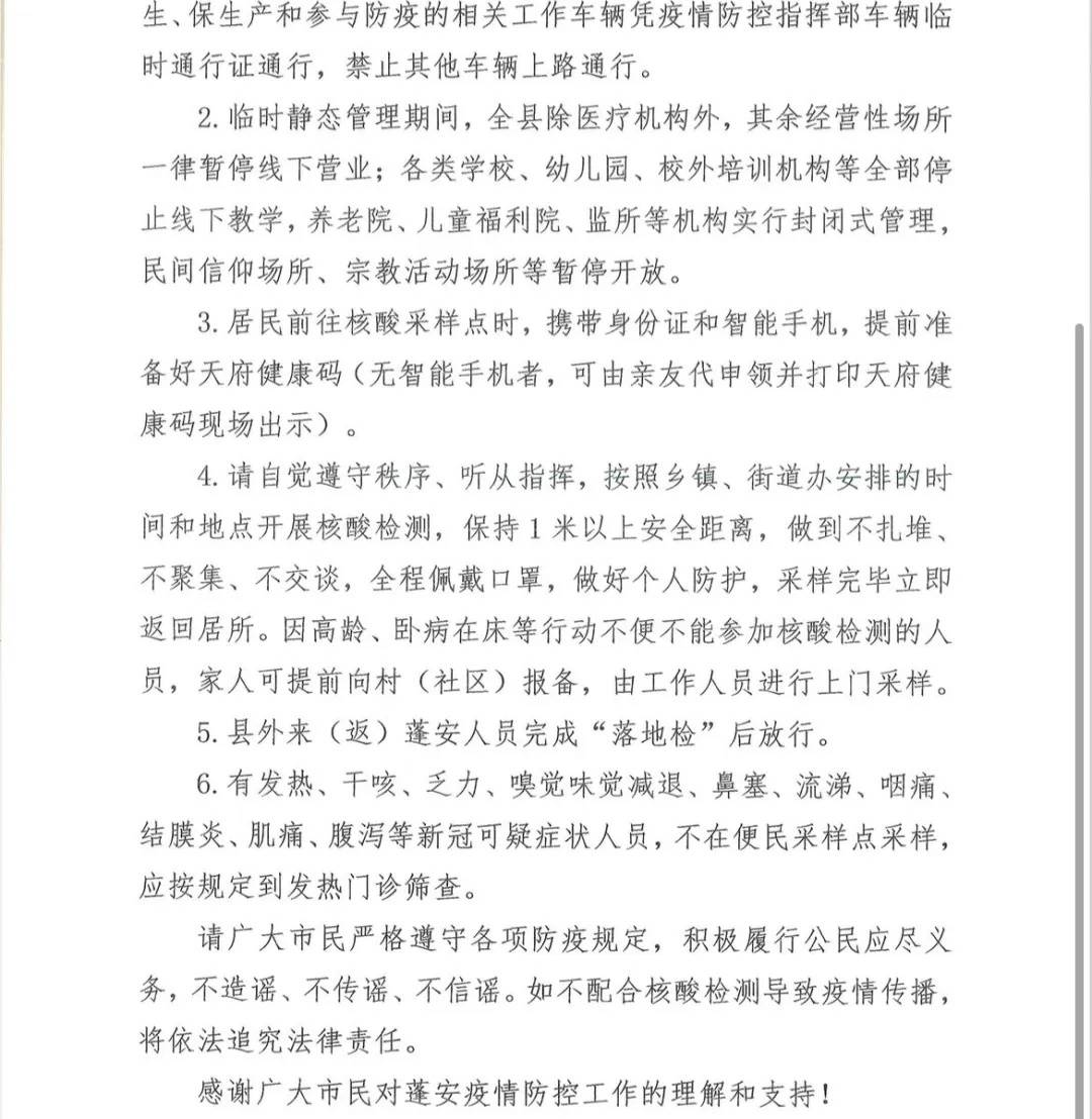 通告要求,蓬安县域内全体居民,包括本地常住人口、暂住人口、临时流动人口、外籍人口等。采样检测时48小时内接种过新冠肺炎疫苗的,经向村(社区)报备后可不参与当日采样检测。