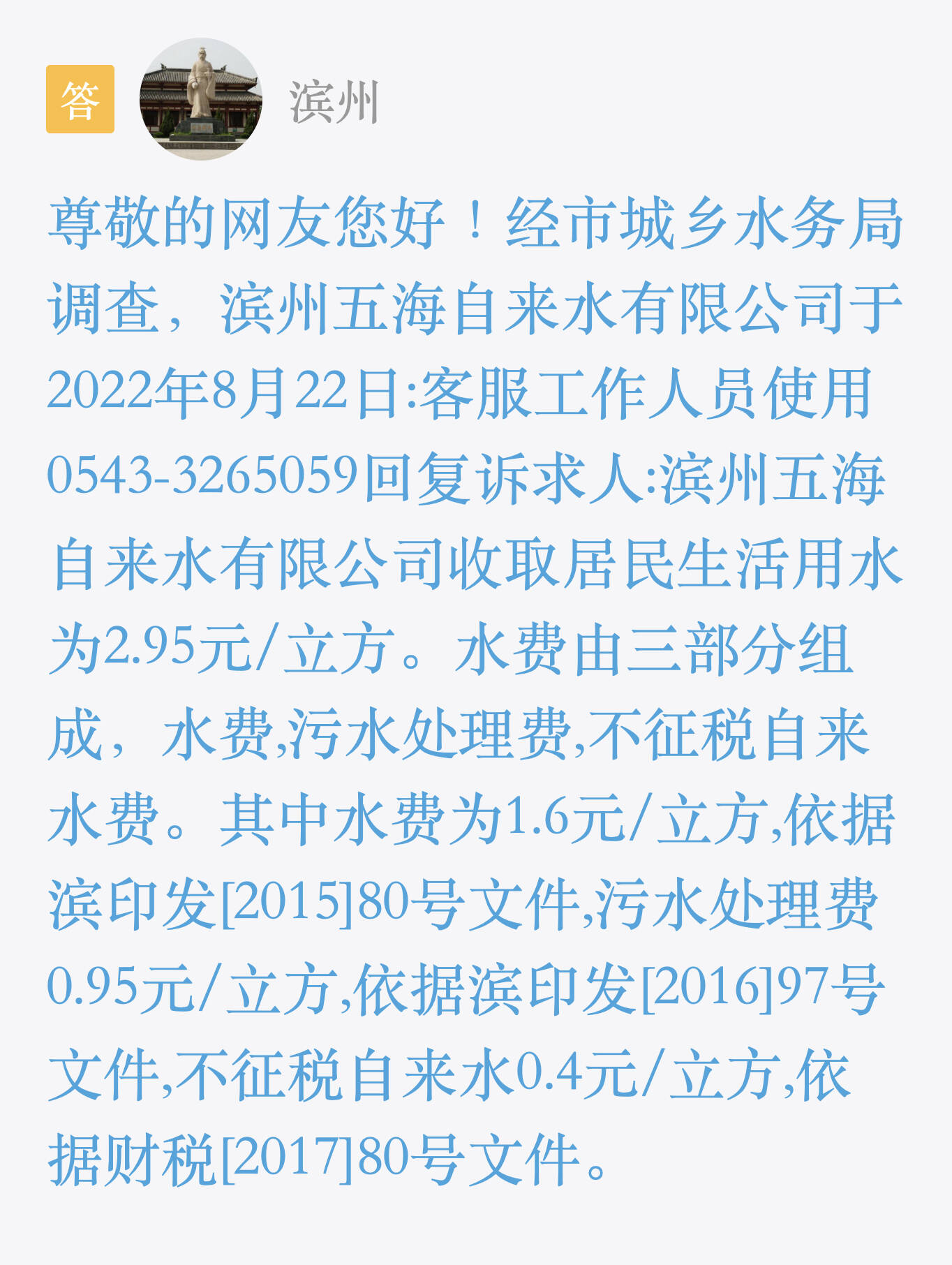 针对此问题,滨州市城乡水务局做出回复:滨州五海自来水有限公司收取居民生活用水为2.95元/立方。